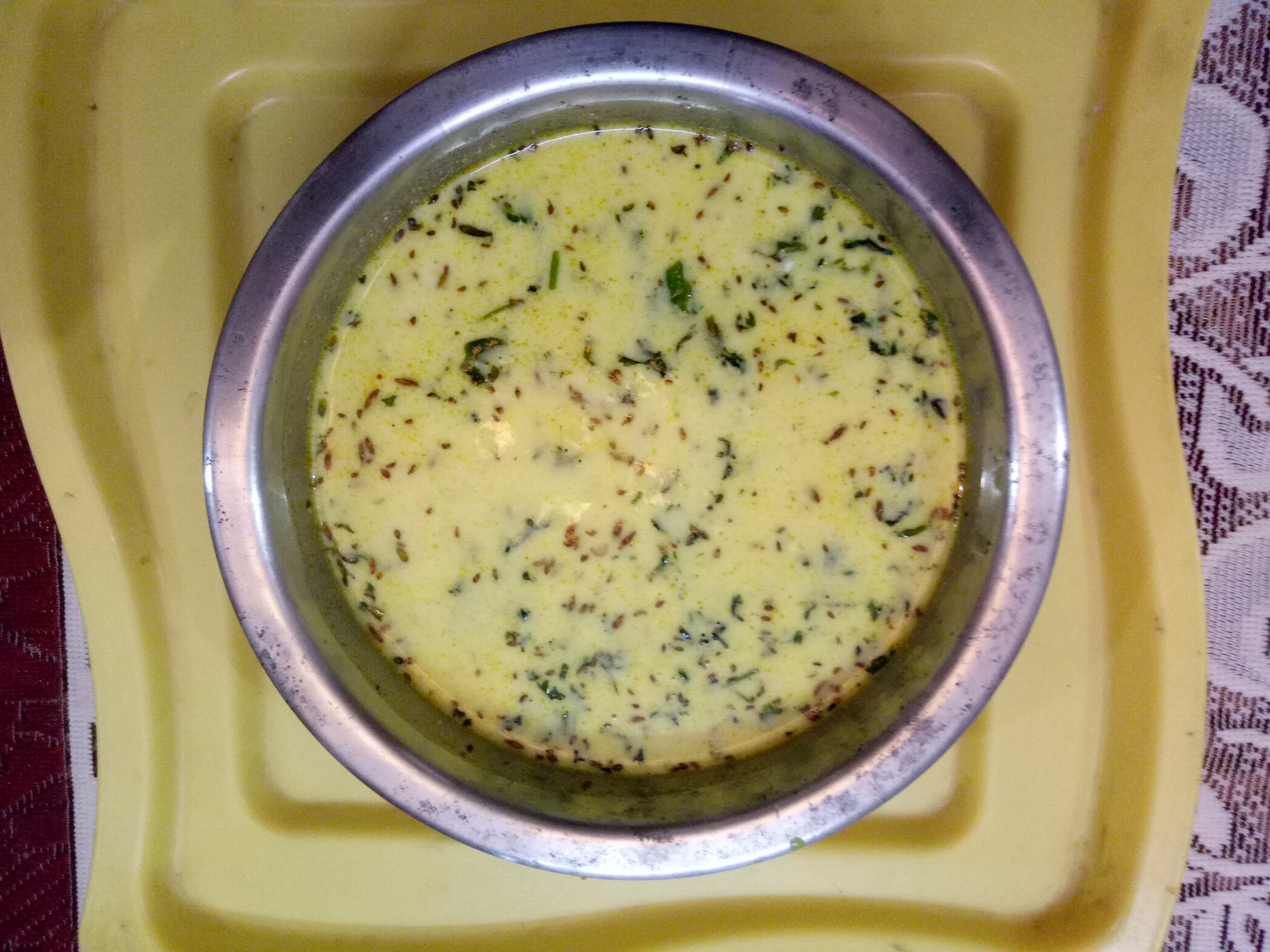 इस सब के बाद आप उसमे लस्सी डाल दे और फिर थोड़ी लाल मिर्च भी डाल दे और याद रखें की कढ़ाई में जब आप लस्सी डाल दें तब आप उसे एक कड़छी से हिलाते रहे 2 मिनट के बाद ही इसे नीचे उतार ले नीचे उतरने के बाद भी इसे 1 मिनट तक हिलाते रहे यदि लस्सी ज्यादा खट्टी है तो इसे थोड़ा मीठा करने के लिए इसमें चीनी के कुछ दाने या पिसी हुई मिश्री डाल सकते हैं, ये कुछ इस प्रकार से दिखेगा।