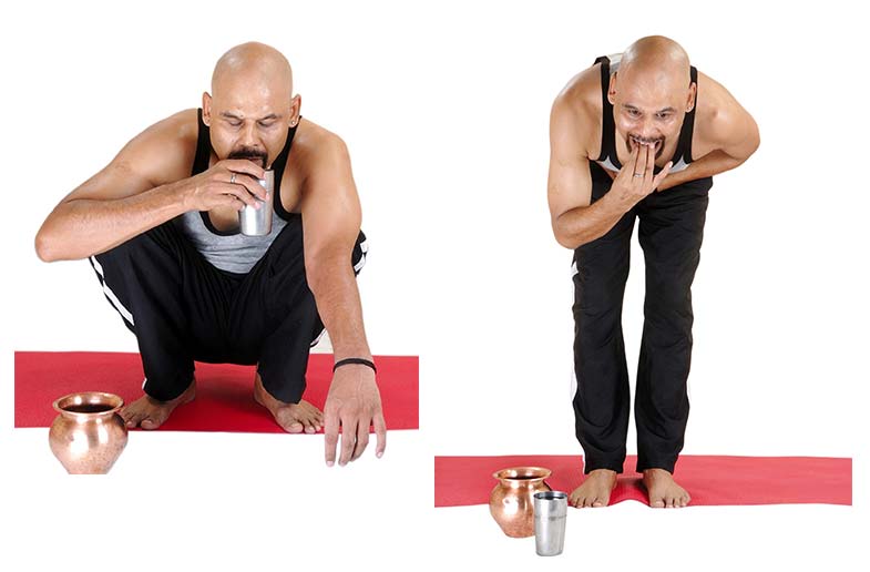 और फिर 1 से 2 लीटर पानी जिसमे थोड़ा सा नमक डला हो पी लेते है और इसके बाद कुछ इस तरह खड़े होकर मुंह में उंगली डालकर उल्टी करने कि कोशिश करते है।
